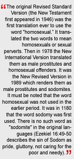 The original Revised Standard Version (the New Testament first appeared in 1946) was the first translation ever to use the word "homosexual.” It translated the two words to mean homosexuals or sexual perverts. Then in 1978 the New International Version translated them as male prostitutes and homosexual offenders. It was the New Revised Version in 1989 which renders them as male prostitutes and sodomites. It must be noted that the word homosexual was not used in the earlier period. It was in 1180 that the word sodomy was first used. There is no such word as "sodomite" in the original languages (Ezekiel 16:49-50 describes the sin of Sodom as pride, gluttony, not caring for the poor and needy).